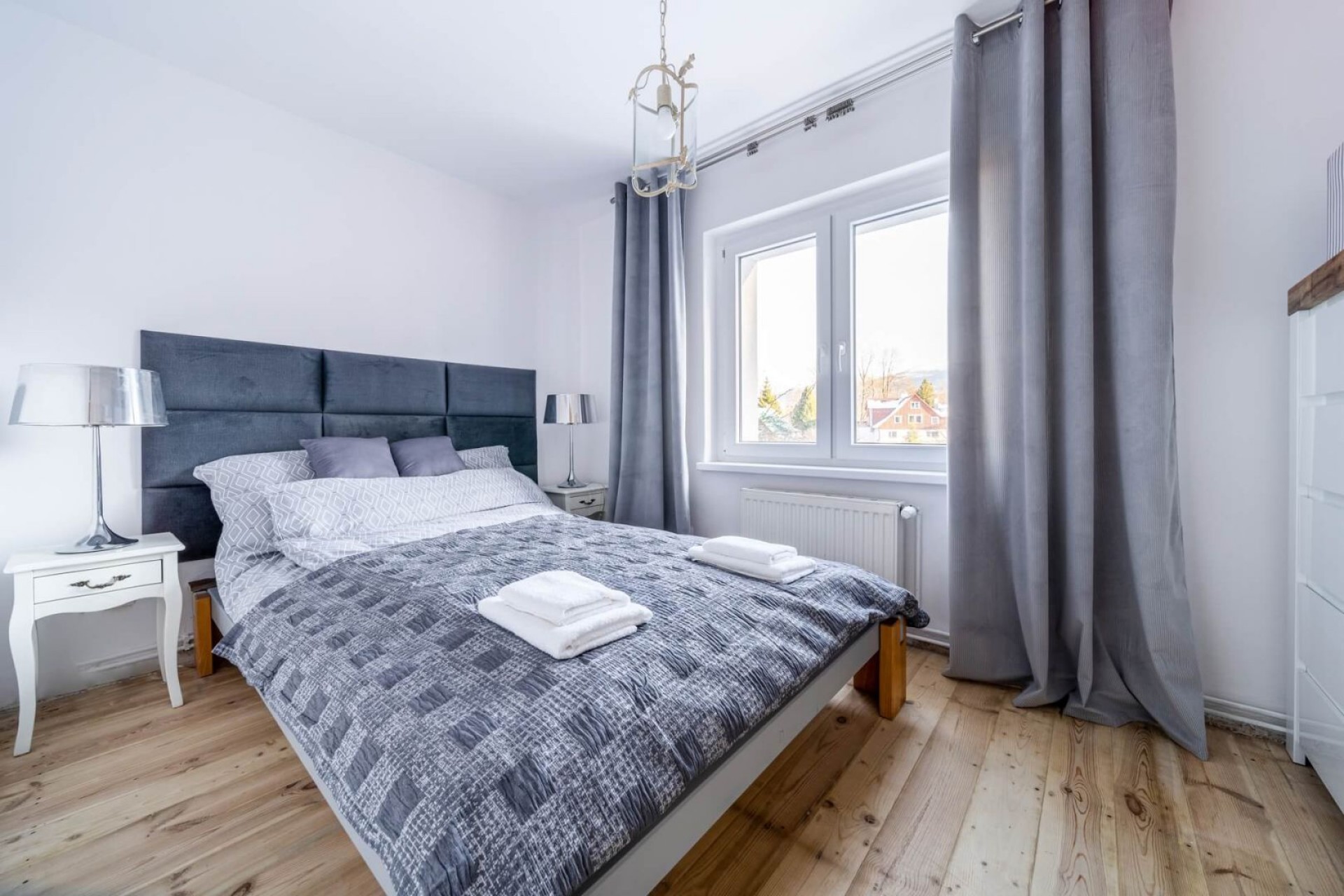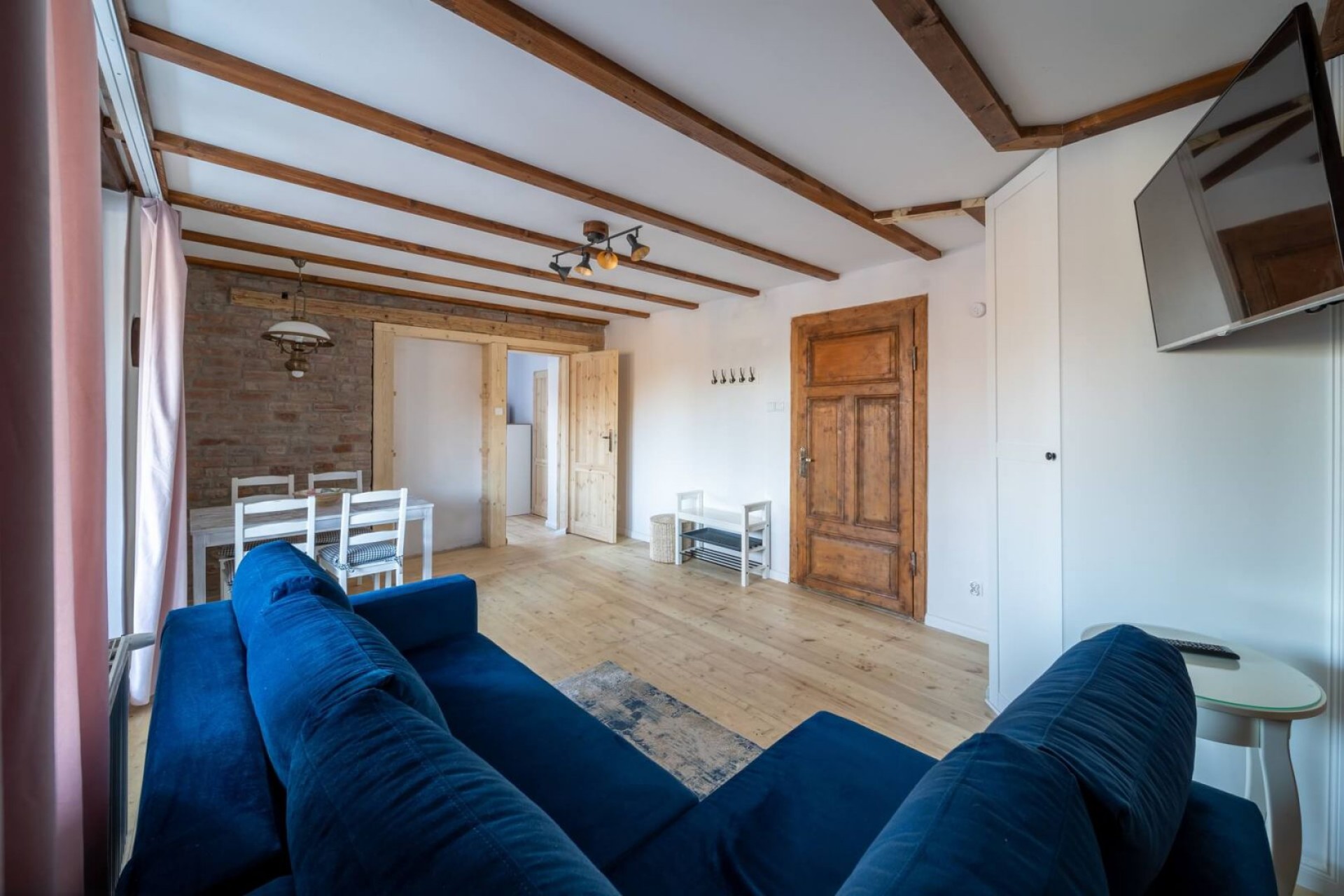 W sypialni znajduje się dwuosobowe łóżko, natomiast dodatkowe miejsce do spania stanowi rozkładana sofa w pokoju dziennym.