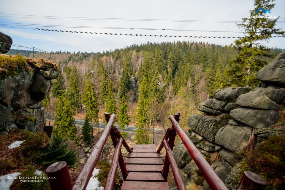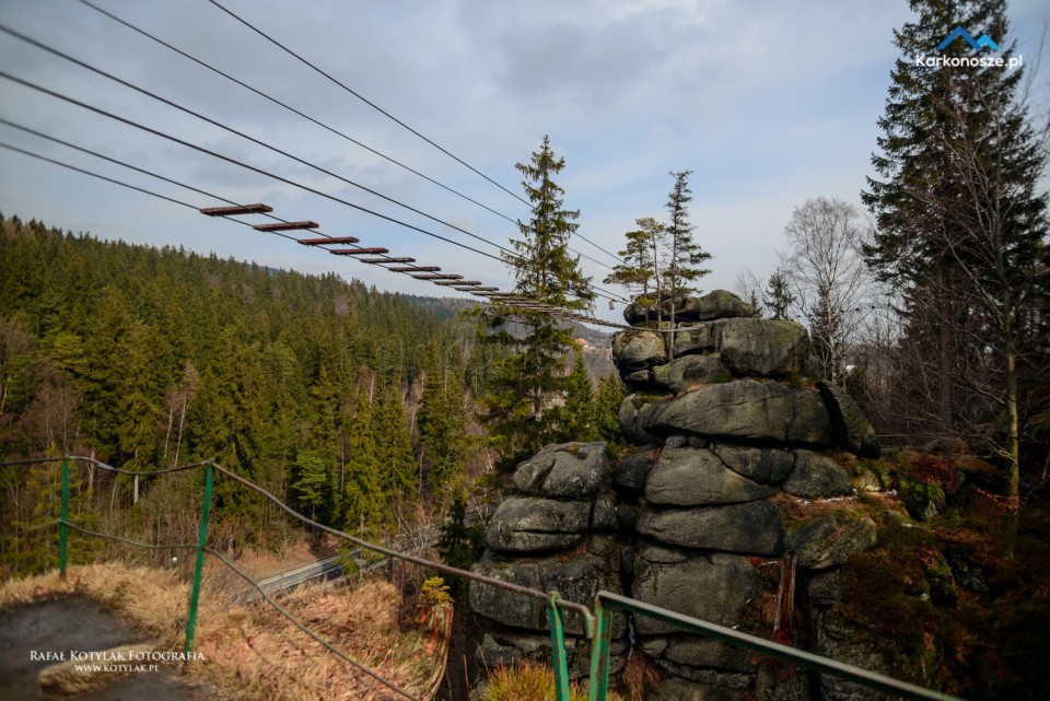 Po przebyciu tego odcinka docieramy do Kruczych Skał, na których znajduje się punkt widokowy oraz profesjonalny park linowy. Tworzą je baszty granitowe o wysokości do 30 metrów, leżące nad rzeką Kamienną na wysokości 718 m n.p.m. Miejsce to jest wspaniałą atrakcją dla wszystkich miłośników ekstremalnych przeżyć, na terenie parku linowego prowadzone są profesjonalne szkolenia wspinaczkowe dla turystów indywidualnych i grupowych, służb państwowych, między innymi GOPR, Policji i Wojska.