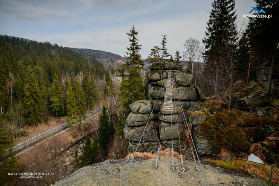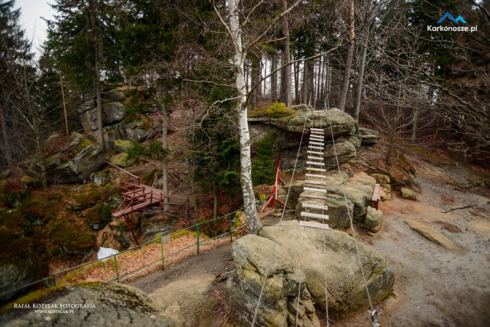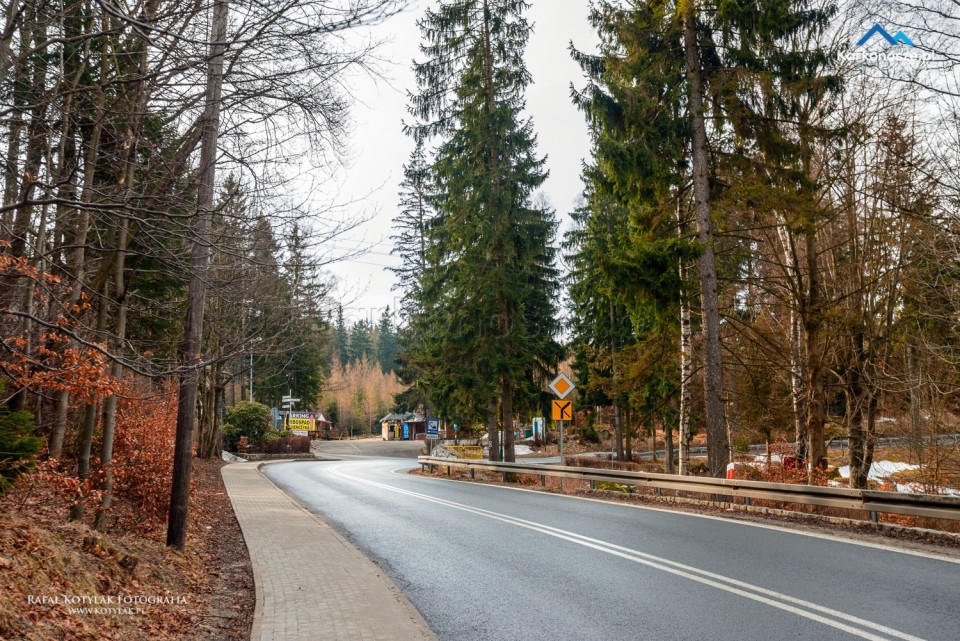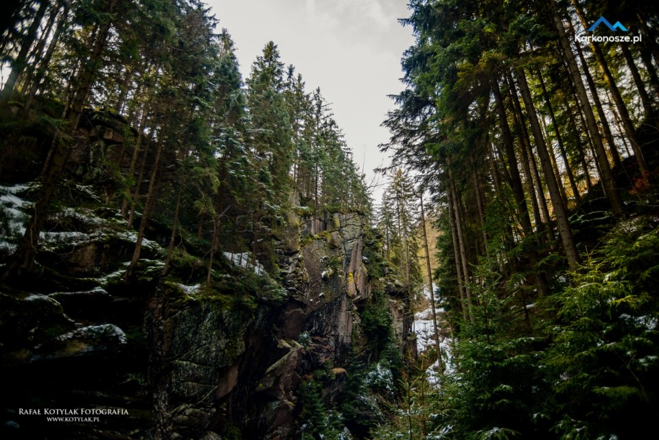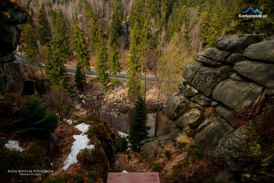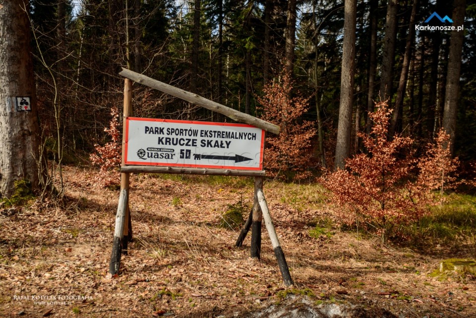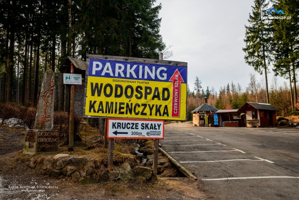 Z parkingu idziemy krótkim, około 150-metrowym odcinkiem Szosy Czeskiej do głównego parkingu pod wodospadem. Zanim jednak udamy się na Kamieńczyk, proponuję odwiedzić pierwszy punkt wycieczki Krucze Skały. W okolice skałek poprowadzi nas 300-metrowy odcinek drogi asfaltowej, przy której ustawione są oznaczenia kierujące nas na nie.