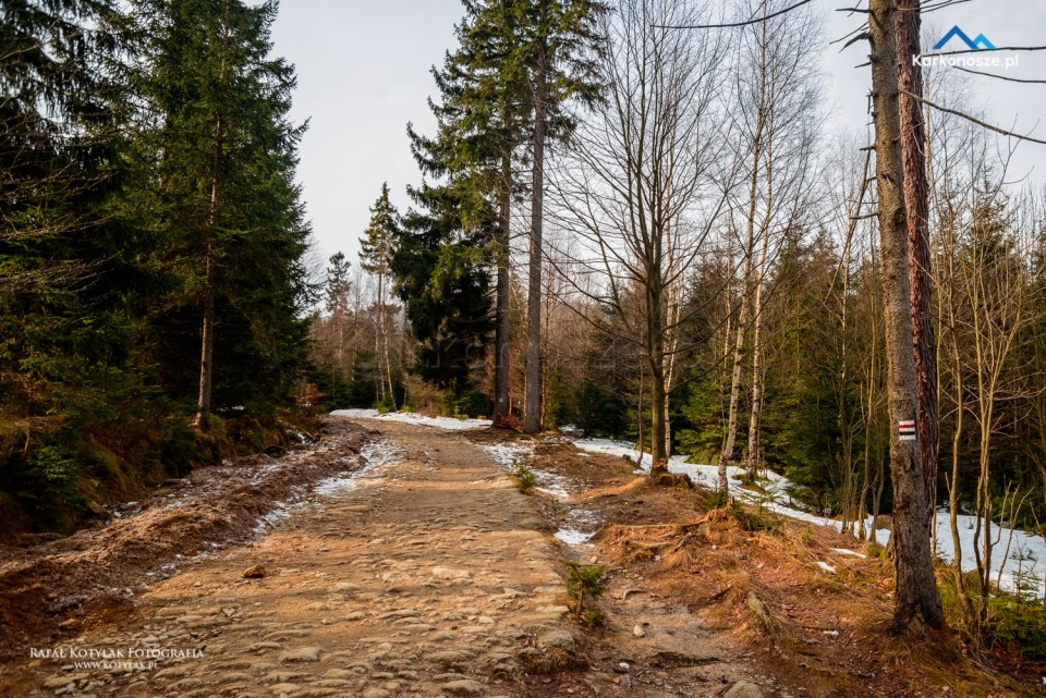 Z Kruczych Skał wracamy drogą do głównego parkingu, a stąd czerwonym szlakiem zmierzamy w kierunku Wodospadu Kamieńczyka. Odcinek ma długość 1 kilometra - przebiega leśną drogą, lekko pod górę i kończy się na Rozdrożu pod Kamieńczykiem 755 m n.p.m.