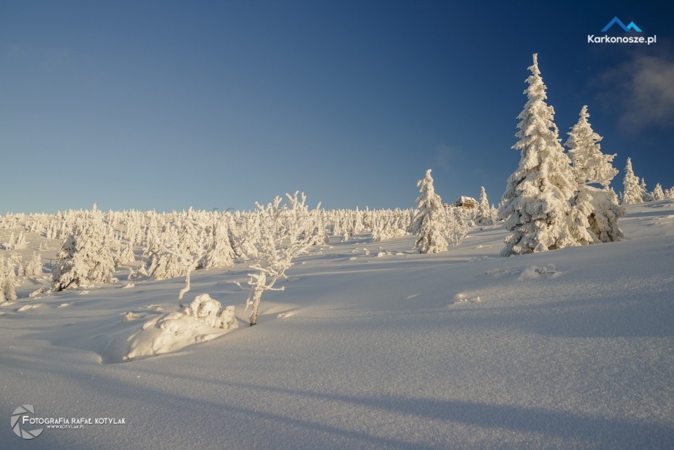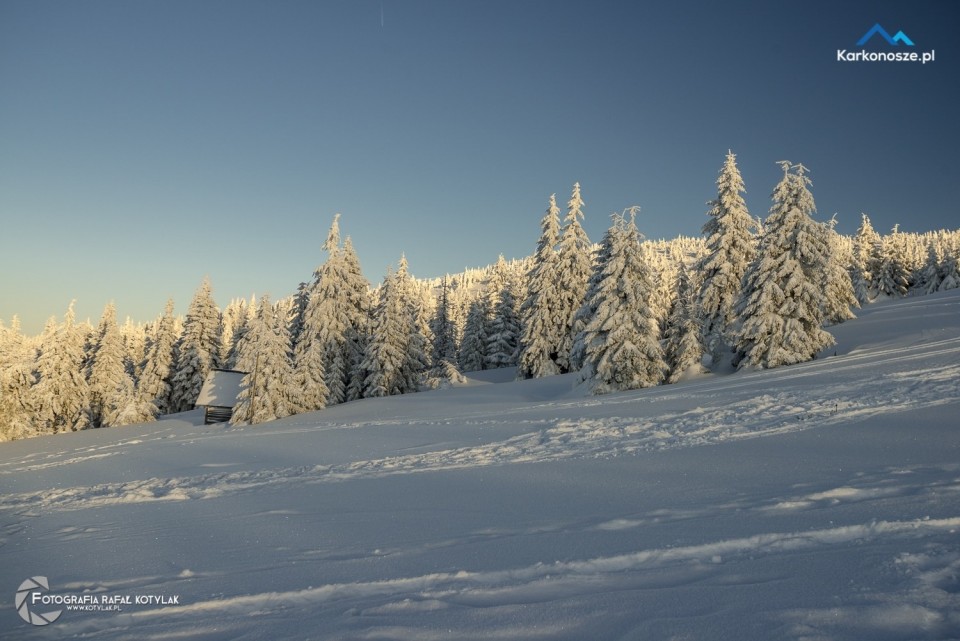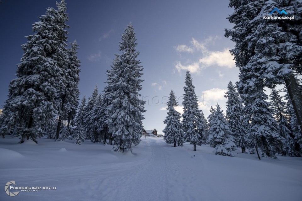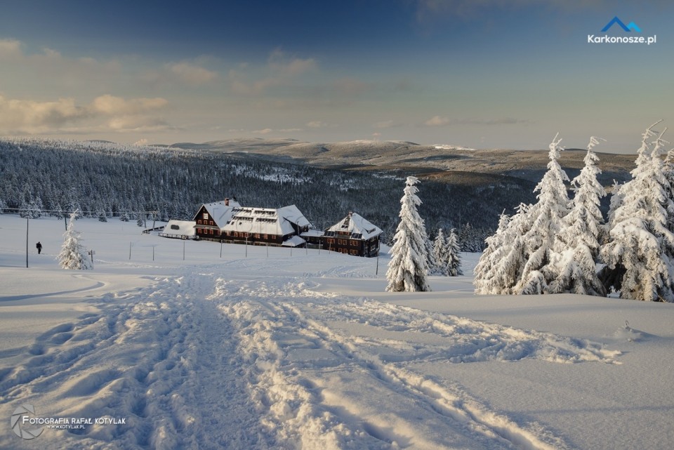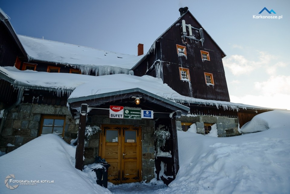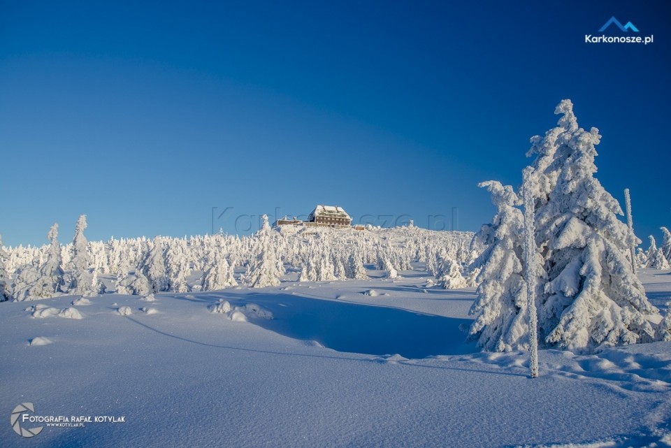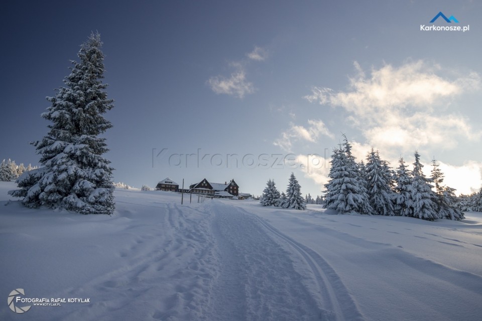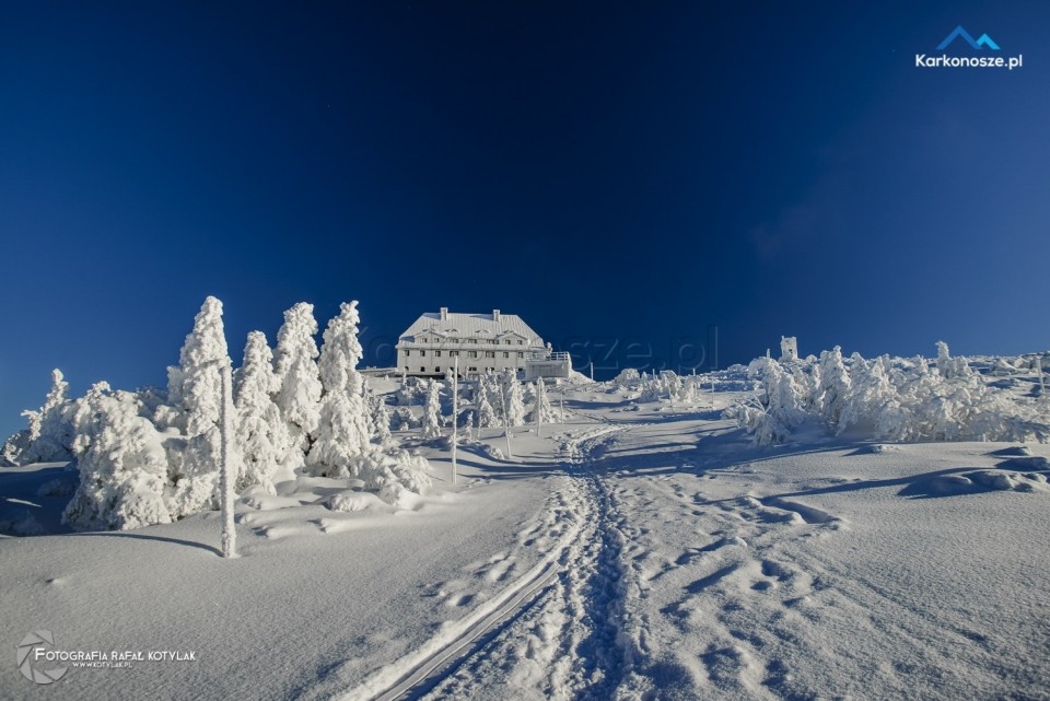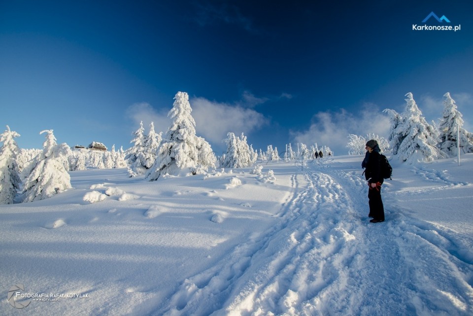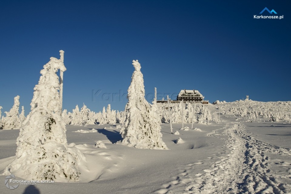 Po krótkim odpoczynku udajemy się na ostatnią część naszej trasy, która ma długość 1,2 kilometra i doprowadzi nas do celu wyprawy - szczytu Szrenica. Tuż przed wejściem do Schroniska na Hali Szrenickiej znajduje się drogowskaz z oznaczonym czerwonym szlakiem do Granicznej Łąki, położonej tuż poniżej Szrenicy. Szlak pnie się ostro pod górę, ale zmęczenie wynagradzają otaczające nas widoki, a ośnieżone świerkowe drzewa tworzą wspaniałe białe formacje. Za plecami - w zimowej scenerii na tle karkonoskiego lasu Schronisko na Hali Szrenickiej, w oddali - szeroka panorama na Góry Izerskie. Po kilkuset metrach po lewej stronie dostrzeżemy także Schronisko na Szrenicy.