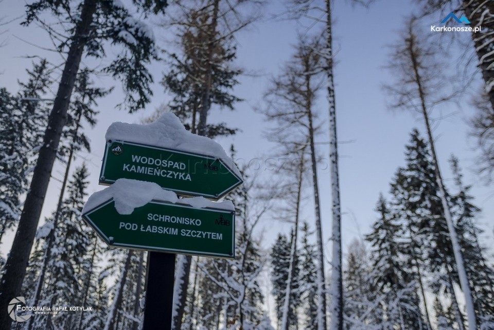 Po przejściu około 300 metrów docieramy na rozdroże, gdzie czarny szlak łączy się z czerwonym Głównym Szlakiem Sudeckim im. Mieczysława Orłowicza, którym udamy się w kierunku celu naszej wycieczki - przez Wodospad Kamieńczyka, Halę Szrenicką na Szrenicę.